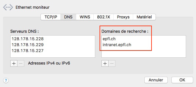 - In the “Search Domains” box, add “epfl.ch” and “intranet.epfl.ch” using the “+”