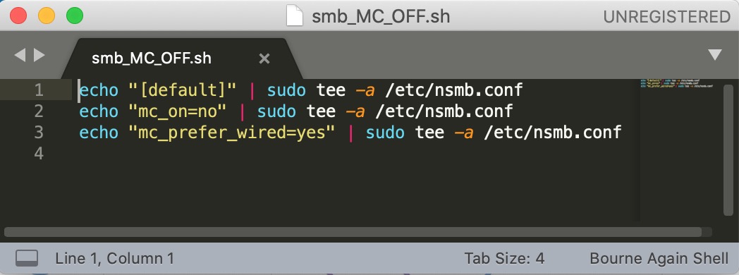 echo ‘mc_on=no’ | sudo tee -a /etc/nsmb.conf